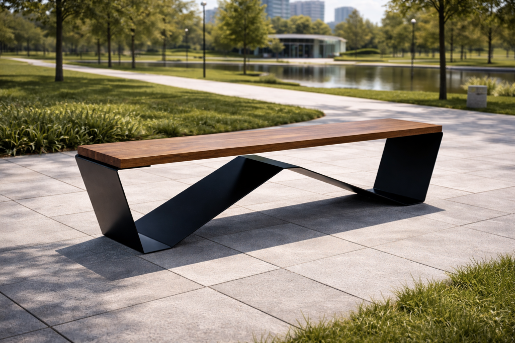 The design combines a calm, linear wooden seat with a sculptural steel base
